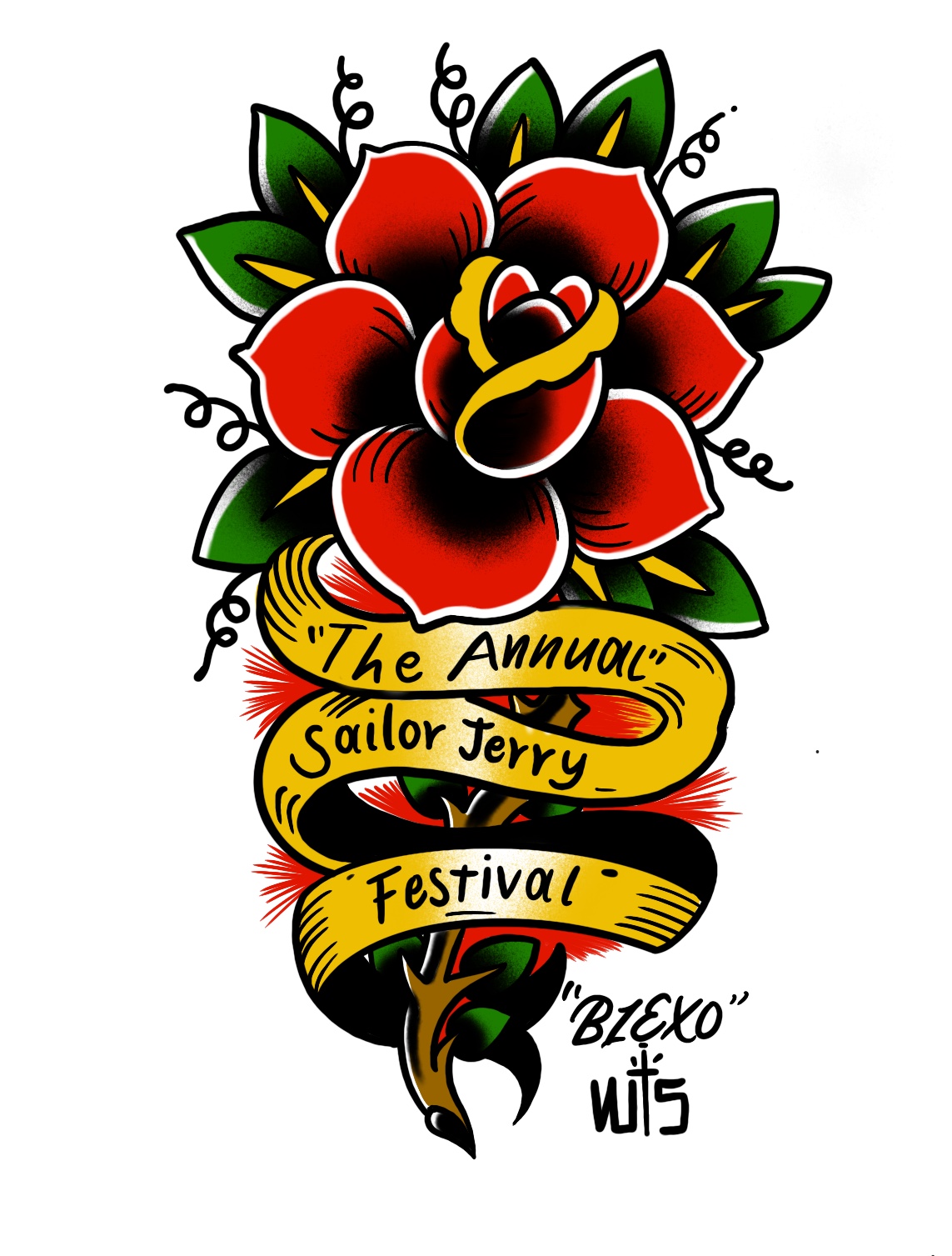 Sailor Jerry Festival ROSE T-shirt // Traditional Cut (Full-Color on Blue, White or Black fabric)